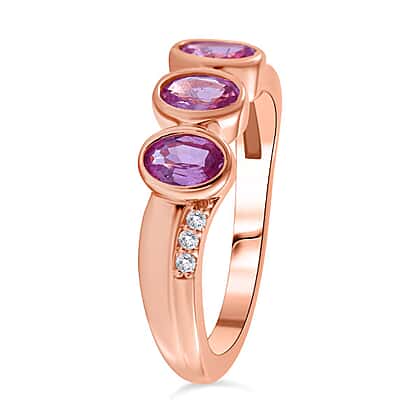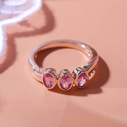- Trilogy ring designed with three pink sapphire ovals set inside a bezel