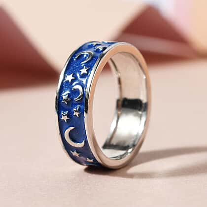 Platinum Overlay Sterling Silver Enamelled Crescent Moon & Star Ring