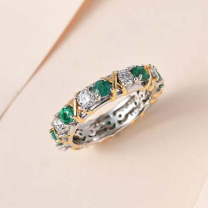 Premium Emerald and Moissanite Band Ring in Platinum Overlay and 18K Yellow Gold Vermeil Plated Sterling Silver 1.96 Ct.