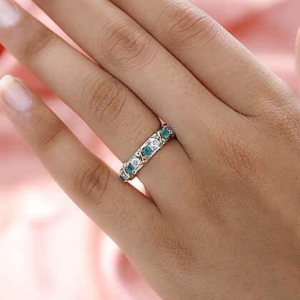 Feel yourself surrounded by the verdant hues of a secluded forest dappled in a luminescent green tinge with this Emerald and Moissanite Band Ring on your finger. The ring is crafted in silver overlaid with platinum. It is laced with the streaks of yellow gold vermeil that lend it the look of a gift from a royal treasure. The emeralds and moissanites are mounted on prongs in an alternating display of green hues and sparkling white shimmer.