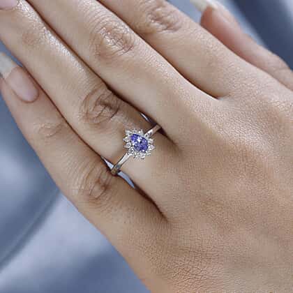 Tanzanite, White Zircon Halo Ring in Rhodium Overlay Sterling Silver
