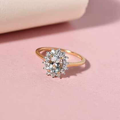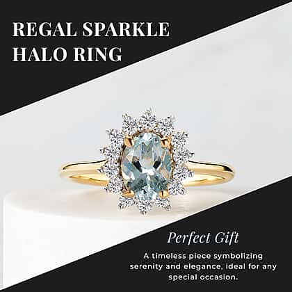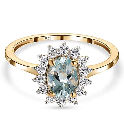 This ring is studded with Aquamarine in Halo ring design. The Sunrays inspire the overall design of the ring. The Aquamarine gemstone is a pale blue variety of the beryl family; it comes in a semi-precious stone. The Zircon covers the gemstone in sun rays design. The ring is crafted in 14K Gold Plated sterling silver.