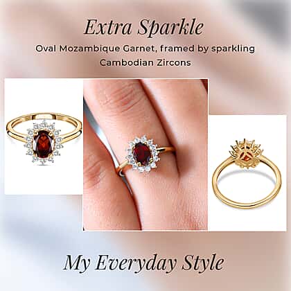 - Gemstone: Oval faceted Mozambique garnet is the main gemstone surrounded by 12 round-cut Natural Cambodian Zircon which is adding an extra sparkle to the overall look of the gold-plated sterling silver ring.