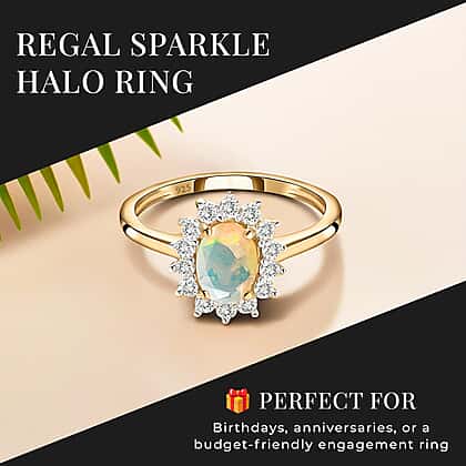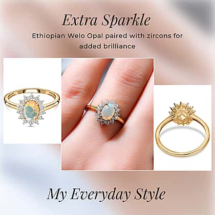 • Gemstone: Oval faceted Ethiopian Welo opal is the main gemstone surrounded by 12 round-cut Natural Cambodian Zircon which is adding an extra sparkle to the overall look of the 18K yellow gold vermeil over a sterling silver ring.