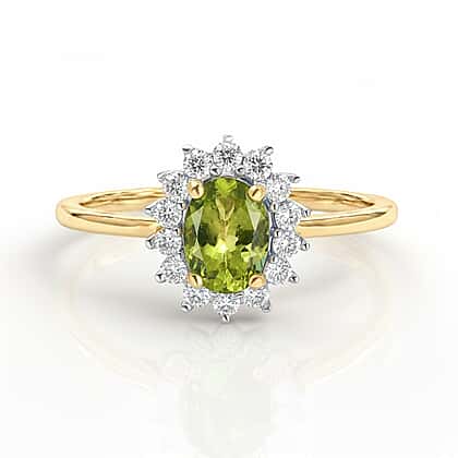 - Gemstone: Oval faceted Hebei peridot is the main gemstone surrounded by 12 round-cut Natural Cambodian Zircon which is adding an extra sparkle to the overall look of the gold-plated sterling silver ring.