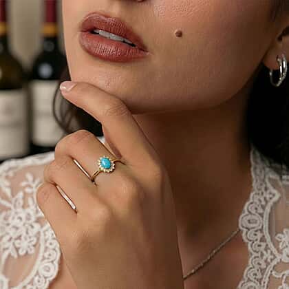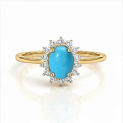 Indulge in the breathtaking beauty of our Arizona Sleeping Beauty Turquoise and Natural Cambodian Zircon Halo Ring in 18K Vermeil Yellow Gold Plated Sterling Silver. The mesmerising blue hue of the Arizona Sleeping Beauty Turquoise is enhanced by the sparkling Cambodian Zircon halo, creating a truly stunning effect. The band is crafted from high-quality 18K Vermeil Yellow Gold Plated Sterling Silver, providing durability and luxury. Perfect as a statement piece or unique occasion accessory, this ring invests in timeless elegance and sophistication. Shop now and experience the luxury of this exquisite ring.
