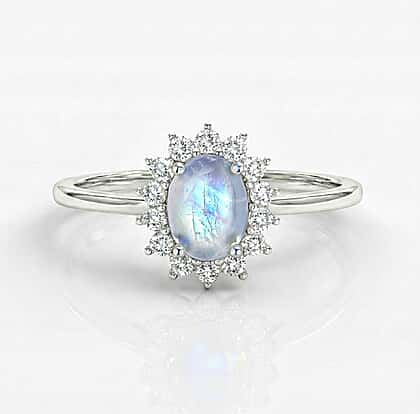 The ring features a round rainbow moonstone of 1.200 carat surrounded by natural Cambodian zircons. The ring is made of sterling silver with a platinum overlay that adds durability and shine. The rainbow moonstone displays a beautiful blue sheen that changes with the light, while the zircons sparkle like diamonds.