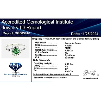 Appraised and Certified RHAPSODY AAAA Tsavorite Garnet, (E-F VS) Diamond Halo Ring in 950 Platinum 1.40 Ct.