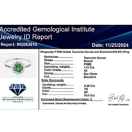 Rhapsody 950 Platinum AAAA Tsavorite Garnet White Diamond VS Ring 1.40 ct, Platinum Wt. 5.49 Gms 1.400 Ct.