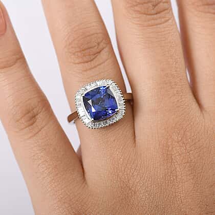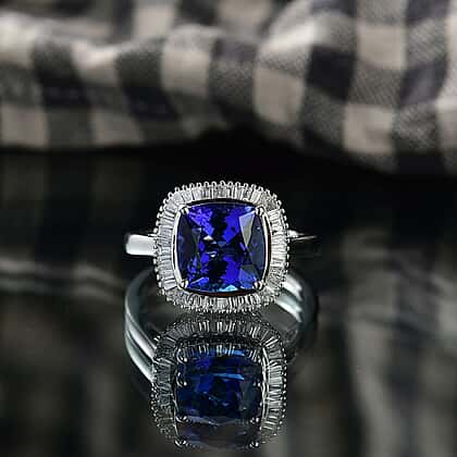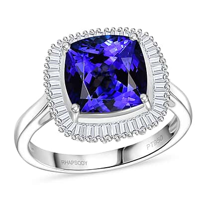 Rhapsody 950 Platinum AAAA Tanzanite & VS-E-F White Diamond Cushion Cut Halo Ring 5.03 Ct, Platinum Wt. 6.70 Gms