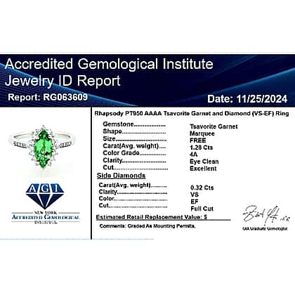 Appraised and Certified RHAPSODY AAAA Tsavorite Garnet, (E-F VS) Diamond Halo Ring in 950 Platinum 1.60 Ct.