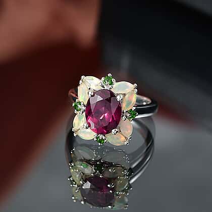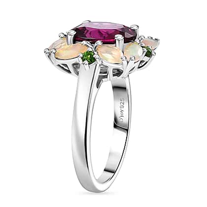 Rhodolite Garnet , Natural Chrome Diopside , Ethiopian Opal Main Stone With Side Stone Ring in Rhodium Overlay Sterling Silver 4.38 ct 4.042 Ct.