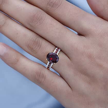 - Features a captivating, oval-cut Rhodolite garnet centre.