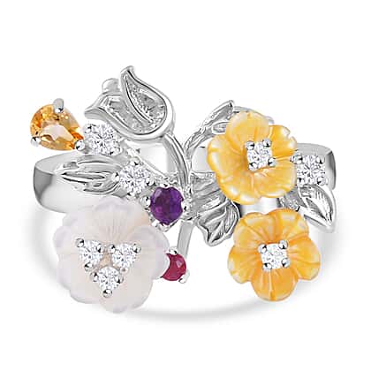 This stunning beauty features a White Mother of Pearl in Flower Cut, flanked by two equally captivating Yellow Mother of Pearls. These delicate flowers serve as the centrepiece of an intricate floral design, reminiscent of a blossoming spring garden. Adding a burst of colour to this floral masterpiece are faceted Rhodolite Garnets amid an array of multi-coloured gemstones. These gemstones in sterling silver create a medley of colours that fill your day with an abundance of creative energy.
