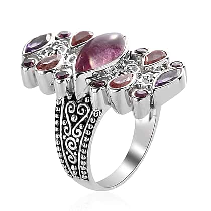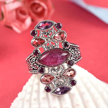 - GEMSTONE: Graced by multiple gemstones Rhodolite garnet, Ruby Zoisite, Amethyst, and the doublet quartz, this ring is sure to win every onlooker's attention