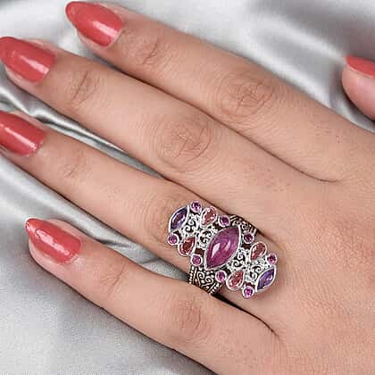 Sajen Silver Cultural Flair Collection - Rhodolite Garnet, Ruby Zoisite, Amethyst & Doublet Quartz Enamelled Ring in Platinum Overlay Sterling Silver 4.70 Ct.