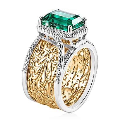 Command attention with this stackable ring set, where bold structure meets intricate detailing. The centerpiece features a vivid peacock triplet quartz stone, cut in a sharp rectangular shape that highlights its rich, shifting green-blue tones. Surrounding the stone, the band showcases ornate filigree work in yellow brass, adding depth and texture through its carved, openwork design. The contrast between the polished silver-tone accents and the gold base creates a layered, dimensional look. The combination of bold gemstone colour and detailed metalwork gives the set a strong visual presence, while the stackable format allows for varied styling. A design built around contrast, craftsmanship, and statement-making detail.