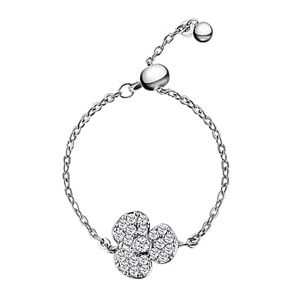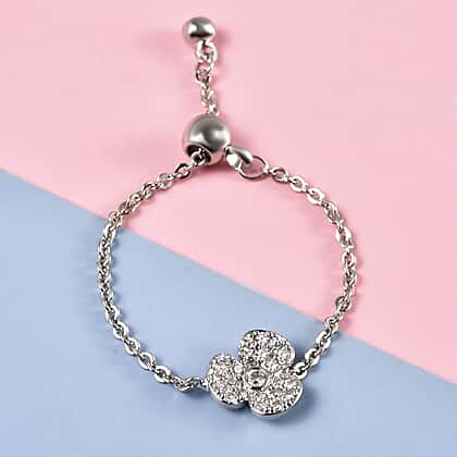Simulated Diamond Floral Adjustable Size I-U Bolo Ring in Silver Tone