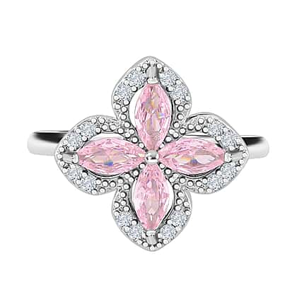 This beautiful ring features a gorgeous pattern of pink and white simulated diamonds in a unique clover style design, set on a silver tone base. The stones are placed all around the ring in a floral pattern, beautifully spread out like a flower. The ring is made of pure white brass, and the total weight of 16 stones is 1.525 Carat. It is a great gift for yourself or your loved ones.