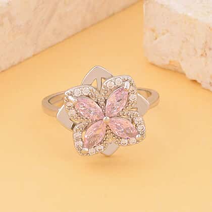 Simulated Pink & White Diamond Clover Spinner Ring in Silver Tone - Adjustable (Size L-R)