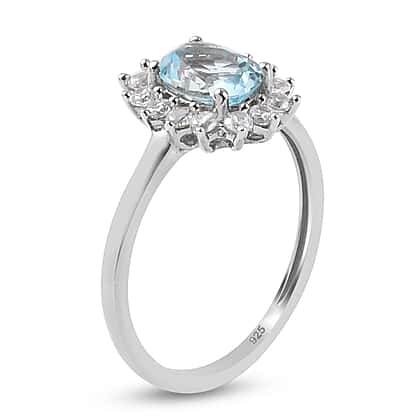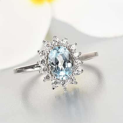 Skyblue Topaz & Natural Zircon Halo Ring in Platinum Overlay Sterling Silver 1.38 Ct.
