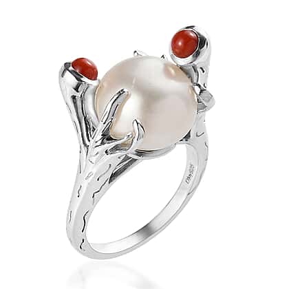 Sundays Child - Freshwater Pearl, Coral Ring in Platinum Overlay Sterling Silver, Silver wt. 5.00 Gms