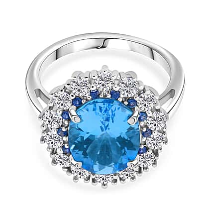 Swiss Blue Topaz, Blue Sapphire, White Zircon Ring in Rhodium OverlaySterling Silver 6.300 Ct.