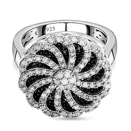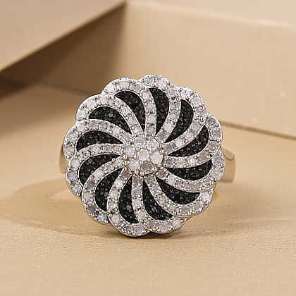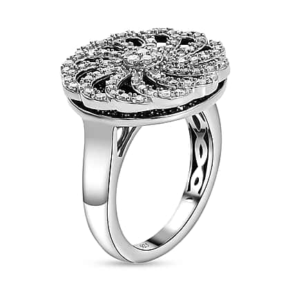 White and Black Diamond Floral Cluster Ring in Platinum Overlay Sterling Silver 0.95 Ct, Silver Wt. 6.19 Gms