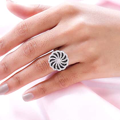 Take your style a notch up with this tantalising floral ring that has petals shaped from alternating rows of black and white diamonds. Set in 6.2 grams of sterling silver with a platinum overlay, the white diamond and black diamond ring features 183 round gemstones in single cuts. The swirling design comes alive on a solid silver band, with a sturdy under-gallery supporting the ornate flower. The ring can be paired with chandelier earrings to complete a glamorous look.
