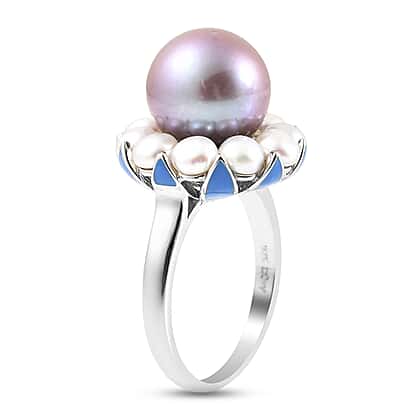 White Edison Pearl and Freshwater Pearl Enamelled Ring in Rhodium Overlay Sterling Silver