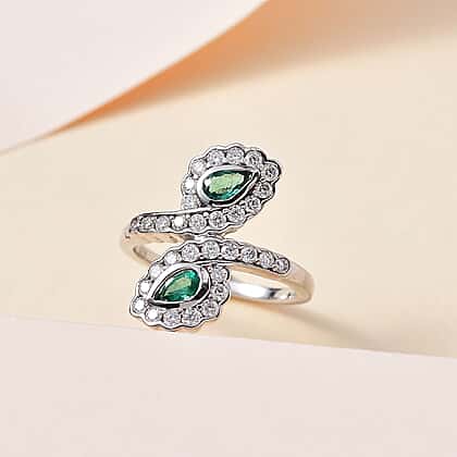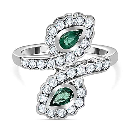 Zambian Emerald & Moissanite Bypass Ring in Platinum Overlay Sterling Silver