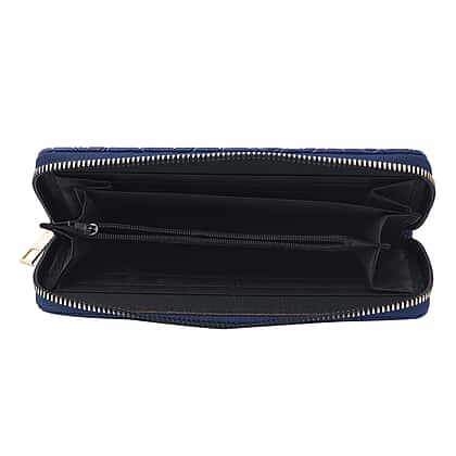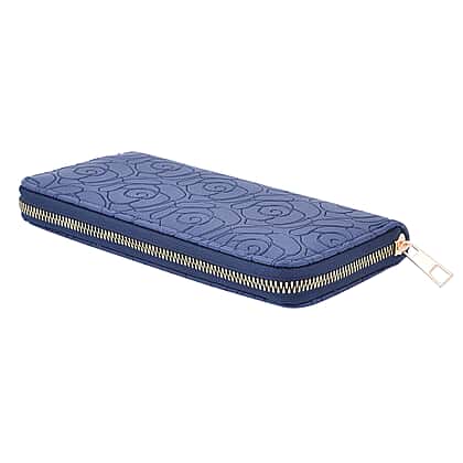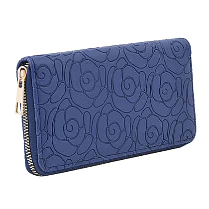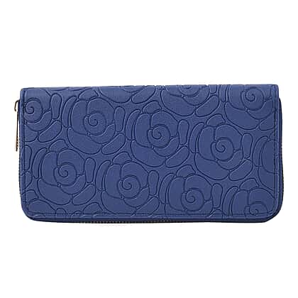 Rose Embossed Pattern Long Size Wallet with Zipper Closure - Blue