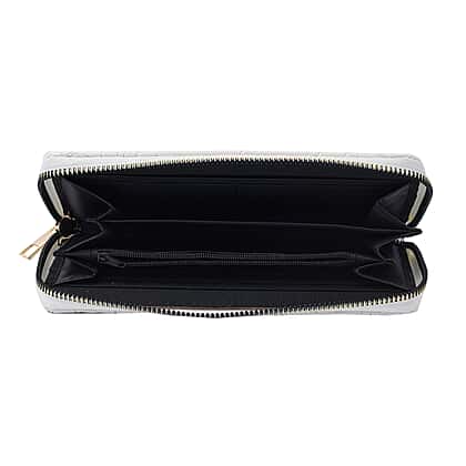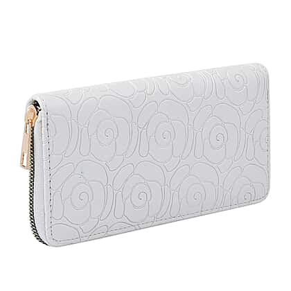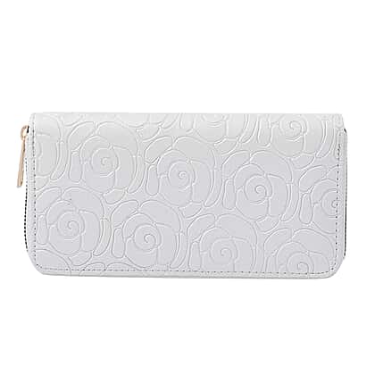 Rose Embossed Pattern Long Size Wallet with Zipper Closure - White