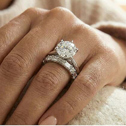 - Platinum overlay mirrors the moissanite radiance in its polished gleam