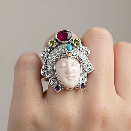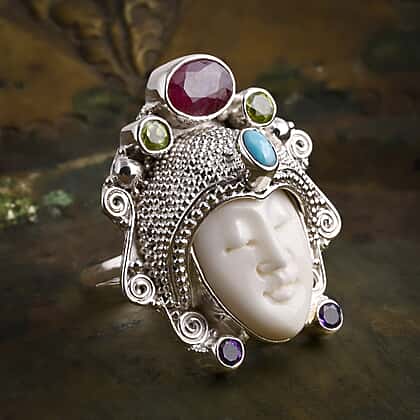 Royal Bali Collection - Ox Bone & Multi Gemstones Ring in Sterling Silver 8.55 Ct, Silver Wt. 12.00 Gms.
