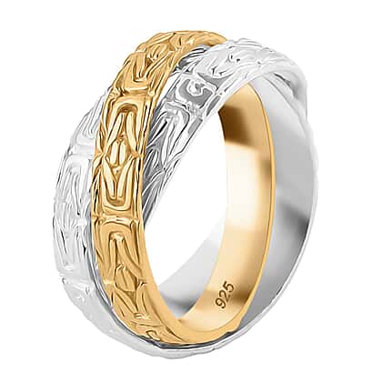This stunning dual-tone interlocking band ring from the Royal Bali collection is a must-have. Displaying a unique byzantine chain design on the outer band, this ring showcases three interlocked rings. It is made of hypoallergenic 925 sterling silver and is perfect for sensitive skin. The ring showcases a beautiful contrast of silver and yellow, giving it a rich look. The polished inner band allows easy sliding of rings on the finger.