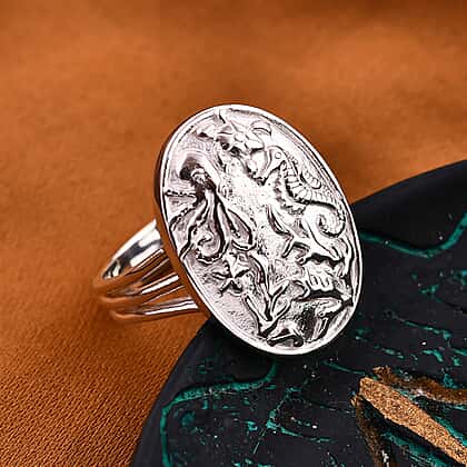 A nature-inspired portrait sits on top of this majestic ring from the premium Royal Bali Collection. Crafted in Sterling Silver, the ring depicts an artist’s imagination of a Sea Safari on a crown shaped like an oval disc. The immaculate artistry tells the story of Balinese folklore in a vivid display of details. The all silver look is impeccable and lends meaning to the unparalleled craftsmanship.