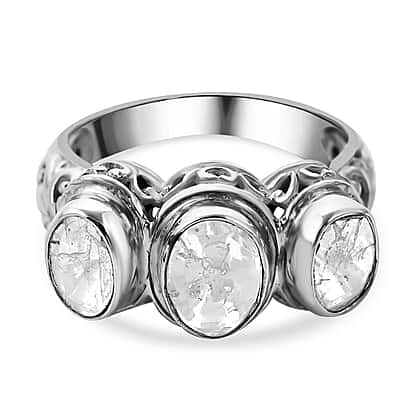 This polki diamond ring will take you on a journey to the enchanting land of Bali. The stunning Trilogy Ring in a Balinese theme is crafted in sterling silver, featuring three bezel-set polki diamonds. The artful work on the shank brings out the ethnic design that is reminiscent of Bali's rich culture. This trilogy ring is an embodiment of timeless love. Slip it on your finger and be transported to the exotic world of love and beauty.