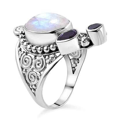 Royal Bali Rainbow Moonstone and Amethyst Ring in Sterling Silver 8.57 Ct, Silver Wt. 8.5 Gms.