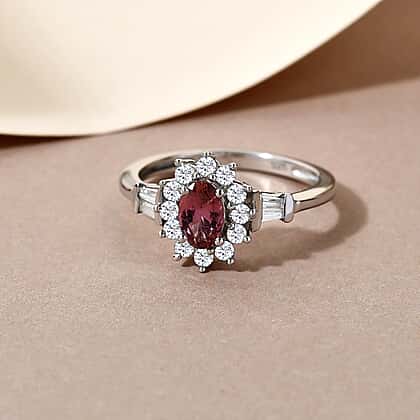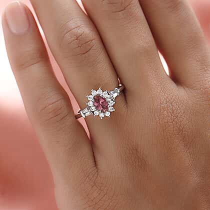 Rubellite and Natural Zircon Halo Ring in Platinum Overlay Sterling Silver.