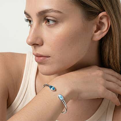 This Sajen Silver larimar and celestial Swiss blue mystic quartz bangle is crafted for those who love pieces with calm energy and striking colour. The Larimar’s naturally soothing blue shade stands out beautifully thanks to its rarity and distinctive Caribbean origin. Swiss blue mystic quartz brings a radiant sparkle that’s both bright and resilient, making it ideal for regular wear. With a rhodium overlay that stays hypoallergenic and tarnish-resistant, the finish keeps its clean brilliance day after day. This 7.5 inch bangle leans into the desire for meaningful colour wrapped in effortless style.