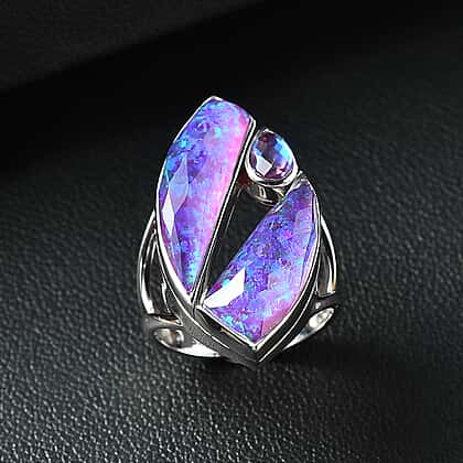 Sajen Silver - Opal Doublet & Rainbow Lavender Ring in Rhodium Overlay Sterling Silver 10.12 Ct, Silver Wt. 5.00 Gms.