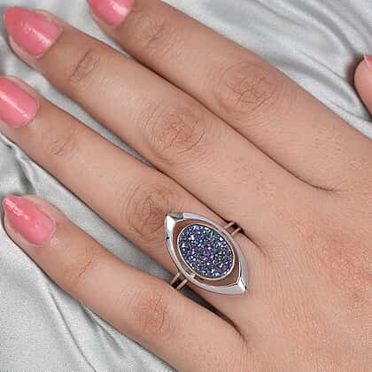 This stunning Sajen silver drusy agate ring in rhodium overlay sterling silver is a must-have. The unique marquise shape of the ring is embellished by an oval-shaped drusy agate set on 925 white silver. A multi-colour drusy agate is a perfect match for every outfit, with the extra shine and lustre giving a ring a smooth finish. This gemstone encourages optimism and positive emotions in the one wearing this ring. Pair this ring with a minimal look to bring out the beauty of this multi-colour drusy agate ring.