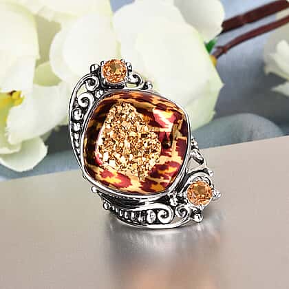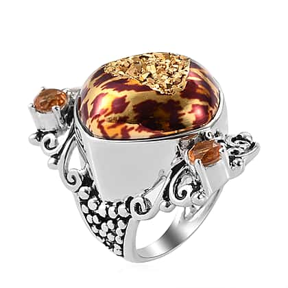 Sajen Silver Leopard Gold Druzy Collection - 24.40 Ct. Agate, Quartz Doublet Ring in Rhodium Plated Sterling Silver