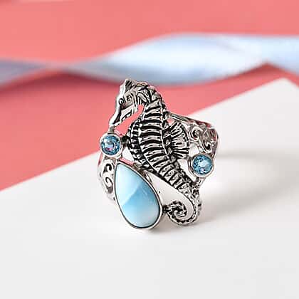 Sajen Silver NATURES JOY Collection- Larimar and Doublet Quartz Enamelled Seahorse Ring in Sterling Silver 1.08 Ct.