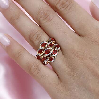 Adorn your finger with the fiery allure of this opulent fire opal cluster ring. This enchanting ring showcases a magnificent dance of red opals interlaced with twinkling white zircon. Set in 18K vermeil yellow gold plated sterling silver, this statement piece is an artistic celebration of colour and glamour, designed to captivate and charm at every glance.