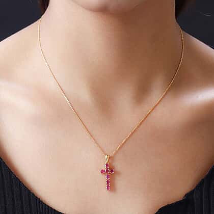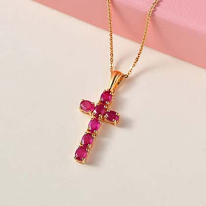 African Ruby Cross Pendant with Chain (Size -20 ) in 18K Vermeil Yellow Gold Plated Sterling Silver 1.77 Ct.