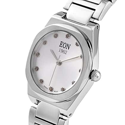 Indulge in the timeless luxury of the EON 1962 Swiss movement watch, featuring a rich silver dial set in a gleaming stainless steel construction. This exquisite timepiece is accented with 12 natural champagne diamonds and silver plating, offering both precision and elegance. Designed for durability and style, it is 5ATM water resistant, ensuring functionality meets sophistication for any occasion.