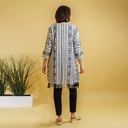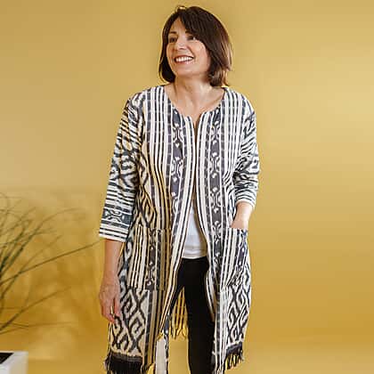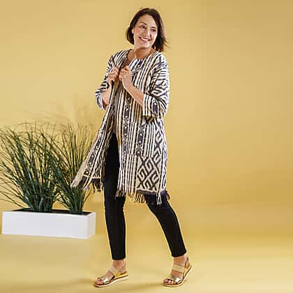 The Bali Collection cotton zipper jacket is a fashion statement that exudes effortless style and sophistication. Made with the finest quality cotton, this jacket is fashionable and incredibly comfortable, making it perfect for any occasion. It has two front pockets, thread detailing on the hemline, a V-neck;ine, and three-quarter sleeves. Its vibrant and colourful design, inspired by Bali's rich culture and traditions, makes this jacket an eye-catching piece to add.