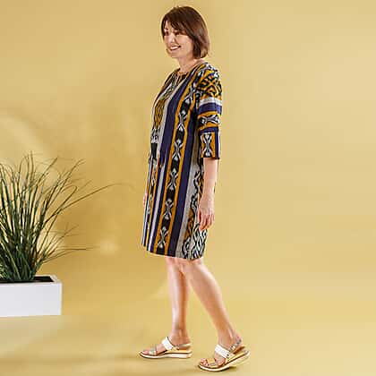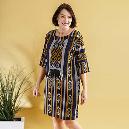 The Bali Collection cotton casual dress is a stunning addition to any wardrobe, offering a perfect blend of comfort and style. This knee-length dress features a classic round neck and three-quarter sleeves, making it the ideal choice for any occasion. In addition, the dress features an eye-catching design that draws inspiration from Bali's rich cultural heritage. The intricate and colourful patterns and motifs are expertly woven into the fabric, creating a stunning, bold, and beautiful visual display.